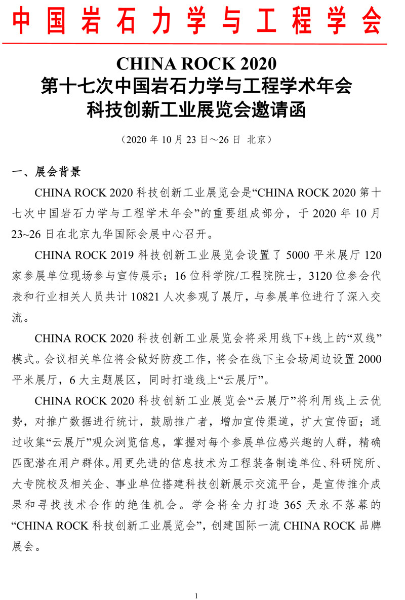 CHINA ROCK 2020 第十七次中國(guó)巖石力學(xué)與工程學(xué)術(shù)年會(huì) 科技創(chuàng)新工業(yè)展覽會(huì)邀請(qǐng)函