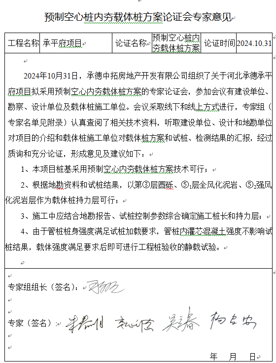 10月31日,承德中拓房地產(chǎn)開發(fā)有限公司組織了關(guān)于河北承德承平府項目擬采用預制空心內(nèi)夯載體樁方案的專家論證會,會議采取線上和線下兩種方式同時進行,參加會議有建設單位、勘察、設計單位及載體樁施