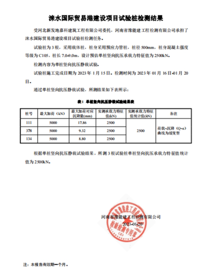 鞏義項(xiàng)目樁徑500mm,樁身采用PHC500-AB-100預(yù)應(yīng)力管樁,持力層為細(xì)砂層,樁長(zhǎng)12米,單樁承載力2400KN。淶水項(xiàng)目樁徑500mm,樁身采用UHC500*II*100 C105高強(qiáng)預(yù)應(yīng)力管樁,持力層為碎石,單樁承載力5000KN。本次試驗(yàn)施工,采用載體樁專利技術(shù),施工速度快捷,質(zhì)量可靠,最終試樁最大加載5000kN,最大變形不超過(guò)18mm,卸荷后殘余沉降最小2.95mm,最大5.5mm。試樁取得圓滿成功。為新年開具取得開門紅。