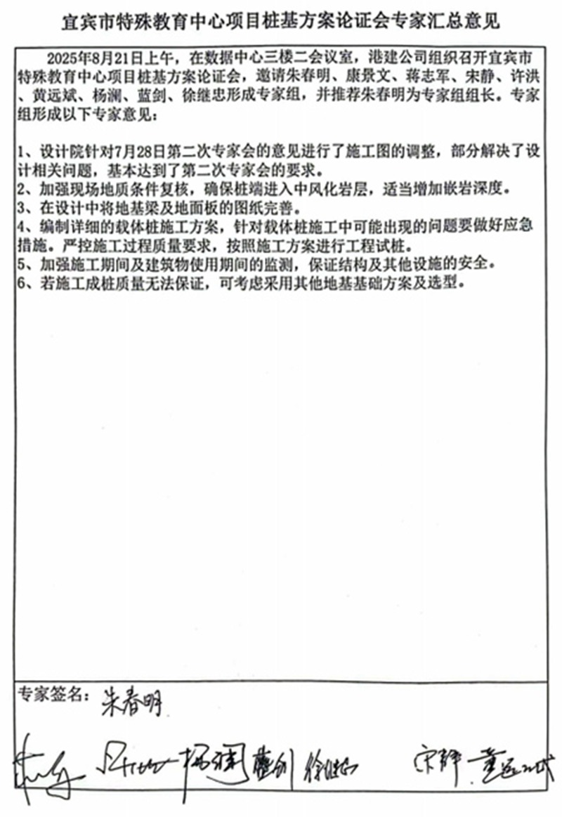 8月21日,宜賓市特殊教育中心項(xiàng)目樁基方案專家評審會(huì)在宜賓市數(shù)據(jù)中心會(huì)議室召開。項(xiàng)目建設(shè)單位、設(shè)計(jì)單位、審圖中心、勘察單位、代建單位、施工單位及政府相關(guān)部門領(lǐng)導(dǎo)參加了會(huì)議。專家組由中國建筑科學(xué)研究院有限公司朱春明研究員、中建西南勘察院康景文大師、四川省建筑科學(xué)研究院有限公司蔣志軍教高、四川省建筑科學(xué)研究院有限公司宋靜教高、四川省宜賓地質(zhì)工程勘察院集團(tuán)有限公司許洪教高、四川省第十二地質(zhì)大隊(duì)黃遠(yuǎn)斌教高、四川凱斯建筑設(shè)計(jì)有限公司楊瀾教高、四川同舟建筑勘察設(shè)計(jì)有限責(zé)任公司藍(lán)劍教高、中冶成都勘察研究總院有限公司徐繼忠教高組成。
