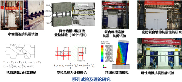 四、對經(jīng)典理論深入研究,擴展應(yīng)用領(lǐng)域。通過對U型筋搭接試驗分析,拓展混凝土錨固理論,提出預(yù)制剪力墻齒槽式連接技術(shù);通過對加肋復(fù)合墻板、開豎縫剪力墻耗能機理試驗研究,提出加強RCS框架抗震韌性提升策略。成果應(yīng)用于工程實踐,發(fā)表論文入選《建筑結(jié)構(gòu)學(xué)報》高被引榜單,多次受邀在全國結(jié)構(gòu)學(xué)術(shù)會議作大會報告。